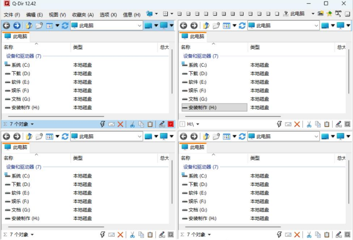 它的使用方式直观得让人惊喜。软件启动后,默认会把界面分成四个独立的窗口,就像把四个普通的“我的电脑”窗口整齐地拼在了一起。你可以让左上角的窗口显示D盘的工作资料,右上角显示插着的U盘,左下角盯着桌面临时文件,右下角则打开下载文件夹。所有内容一目了然,再也不用在任务栏上那一排缩略图里猜哪个是哪个了。
